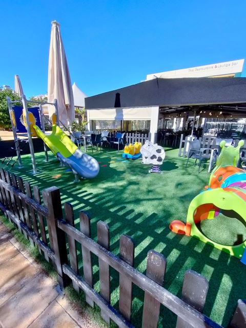 Tiene un parque de juegos de dos plantas y una zona para que las familias se sienten y puedan vigilar a sus hijos mientras disfrutan del brunch o de lo que quieran!