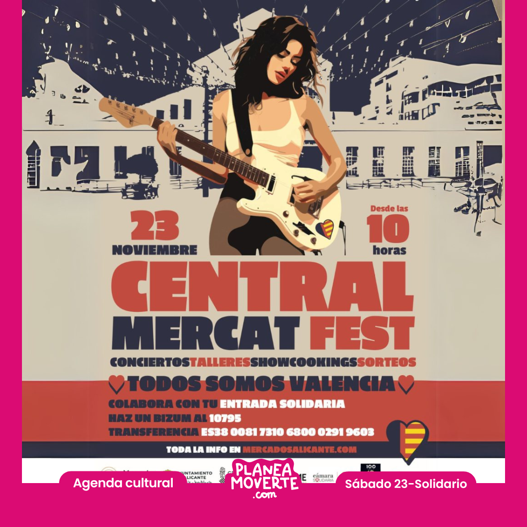 Este sábado, Alicante se une por una gran causa en el Central Mercat Fest . ¡Ven a disfrutar de una mañana única y solidaria para apoyar a las personas afectadas por la DANA! Bajo el lema "𝘛𝘰𝘥𝘰𝘴 𝘴𝘰𝘮𝘰𝘴 𝘝𝘢𝘭𝘦𝘯𝘤𝘪𝘢", el Mercado Central celebra su 102 aniversario con actividades culturales, música y gastronomía, recaudando fondos para quienes más lo necesitan. Talleres infantiles (pintacaras, gafas de realidad virtual) de 10:00h a 13:00h. Espectáculo infantil en la plaza 25 de mayo 11:30 a 12:30. zancudos y malabares By pink red clown de 11:30 a 13:30h. Podéis ver toda la programación aquí.Precio: Colabora con tu entrada solidaria. Haz un bizum a 10795