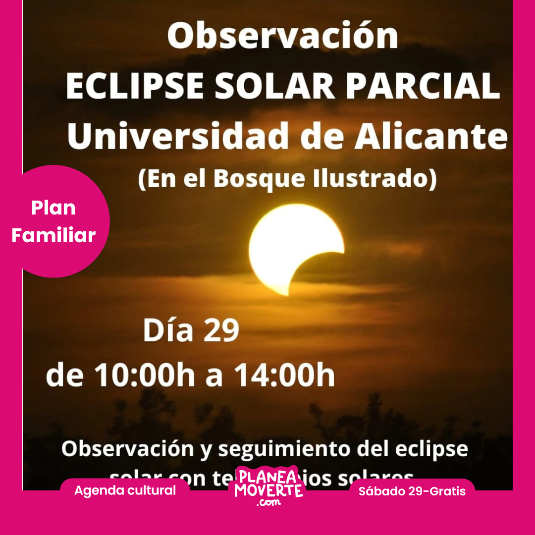 donde ver el eclipse solar en alicante 29 de marzoObservación eclipse solar parcial. Desde el l Bosque Ilustrado del campus de la Universidad de Alicante (@ua_universidad ) se realizará la observación y seguimiento con telescopio solar del eclipse solar parcial que será visible desde nuestra zona en ese día en horario de mañana.