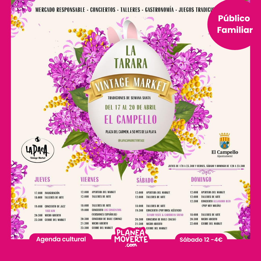 Bienvenidos al Mercado Responsable - Conciertos, Talleres, Gastronomía y Juegos Tradicionales “La Tarara Vintage Market”! Prepárense para vivir una experiencia única del 17 al 20 de abril en la hermosa Plaza del Carmen de El Campello. Como siempre no faltará la música, los puestos con artesanías y productos vintage, además de juegos tradicionales y talleres para peques. No os perdáis todos los detalles de la programación aquí.