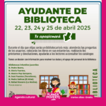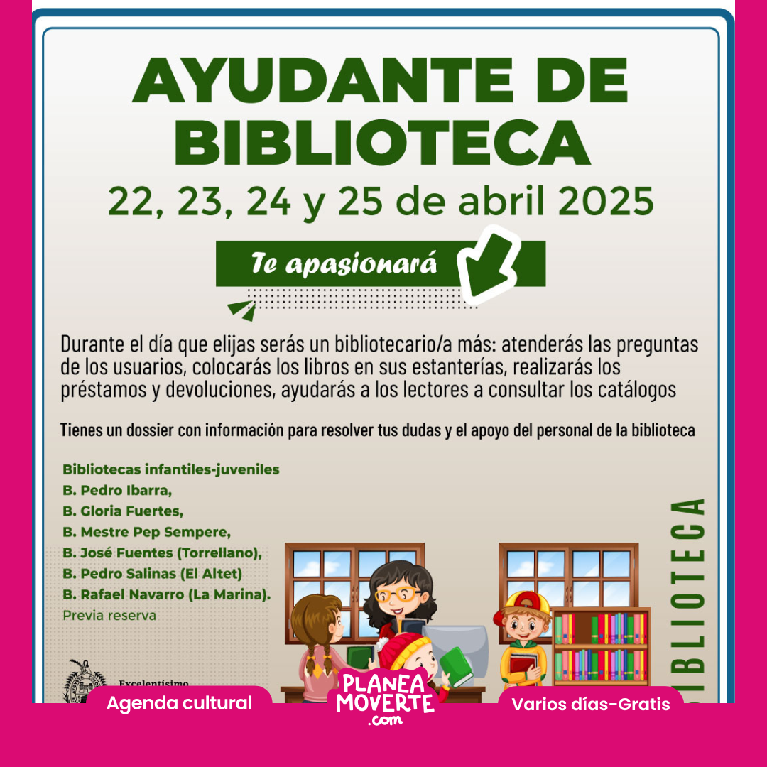 ¿Quieres ser ayudante de biblioteca? Si tienes entre 8 y 13 años, infórmate en cualquier biblioteca infantil-juvenil de Elche que uses habitualmente o tengas más cerca y reserva un día de los siguientes 22, 23, 24 y 25 de abril. Esta actividad consiste en aprender cómo funciona la biblioteca y así poder ayudarnos de forma sencilla en las tareas de atención a los usuarios. La reserva se debe realizar en la sala infantil-juvenil de la biblioteca que uses habitualmente o tengas más cercana, bien presencialmente o por teléfono.Precio: Actividad gratuita con reserva en tu biblioteca más cercana