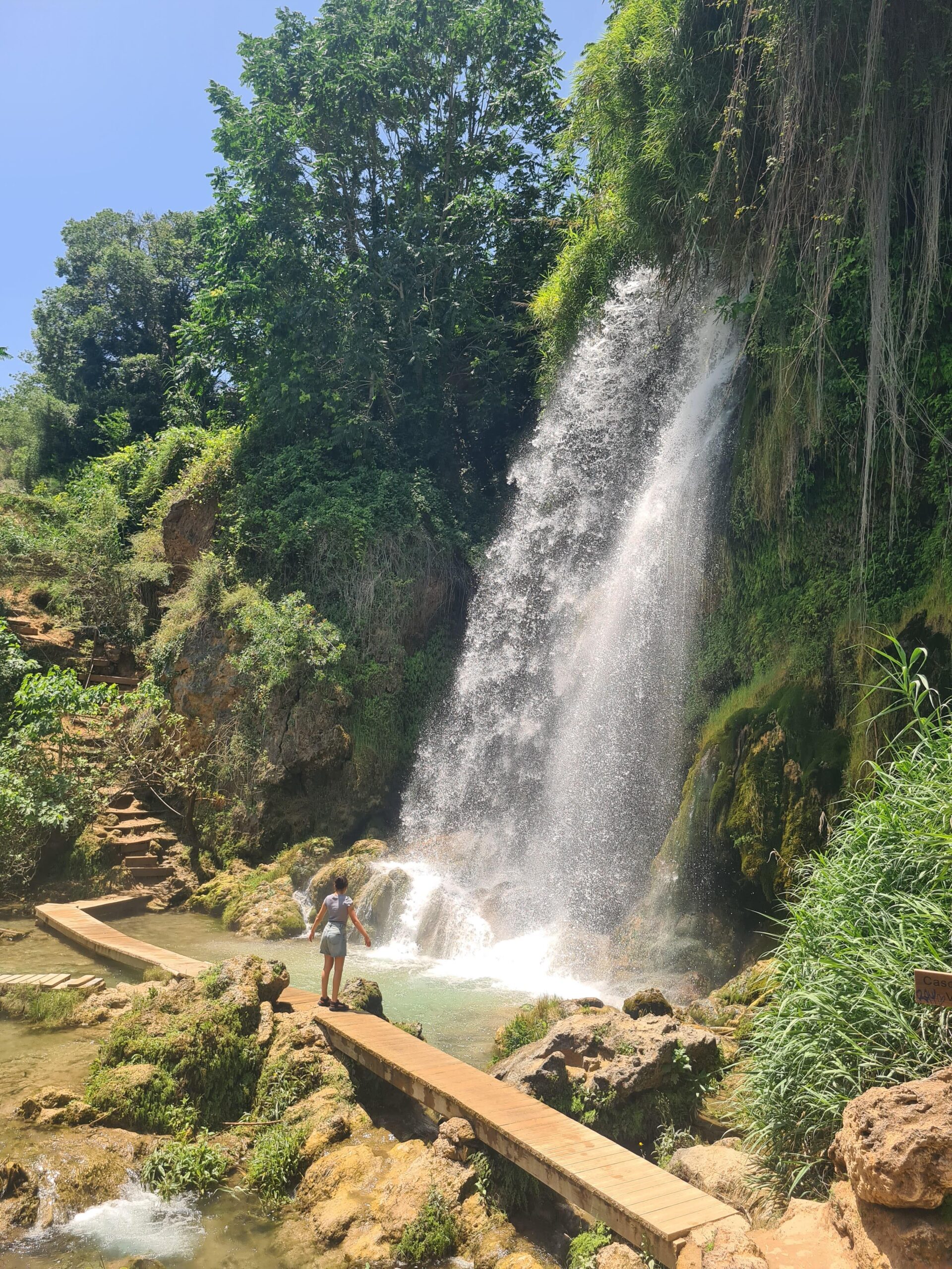 Cuando terminas la escalera tienes una pasarela de madera que te permite pasar por delante de la cascada y el río que forma, no sin mojarte, y poder admirarla como se merece. Esta parte es muy divertida y la pasarela no resbala a pesar de estar mojada y aunque la ropa y demás se moja, en lo que se sigue la ruta se seca, así que en días de calor este agua se agradece.
