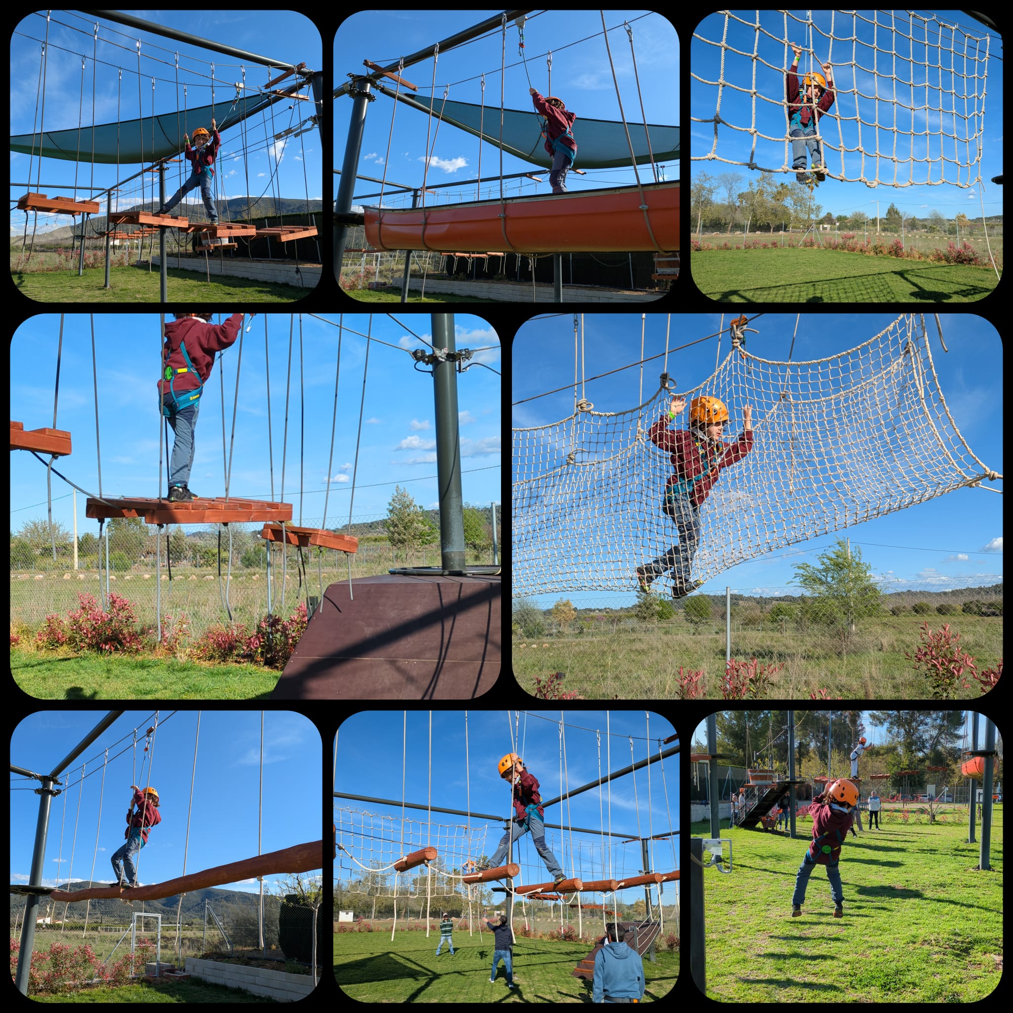 La multiaventura es pequeñita, con 7 postas a unos 2,5 m del suelo. Los niños van asegurados en todo momento y cuesta 12 euros. Lo mejor: ¡pueden dar todas las vueltas que quieran hasta que se cansen!