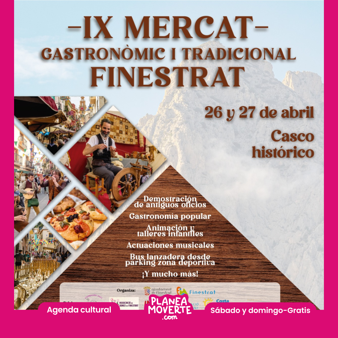 Planes este fin de semana provincia de AlicanteEl casco histórico de Finestrat acoge el fin de semana, 6 y 7 de abril, su “Mercat Gastronòmic i Tradicional”, una alternativa comercial, turística y de ocio para todos los públicos. El Mercat abarcará las principales calles del casco histórico . En estas calles se concentrarán más de 60 puestos de artesanía y demostración de oficios antiguos como el trabajo del hierro, barro, esparto, cantero y plata. También habrá una programación muy especial pensada en los más pequeños como la divertida minidisco infantil, los sorprendentes pintacaras, los cuentacuentos, la granja de animales y la feria de madera. Tenéis toda la programación aquí