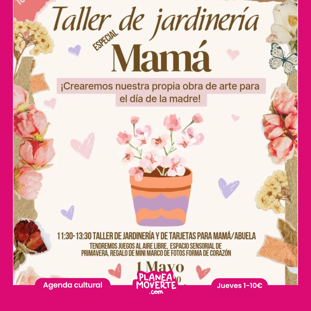 Hemos creado un taller especial para preparar regalitos para el día de la madre, tendremos juegos, propuestas sensoriales, decoraremos un macetero, haremos una tarjeta, pintaremos un marco de fotos... Será un día especial para pasar en familia compartiendo, creando y además preparando unos regalitos especiales para las súper mamás.
