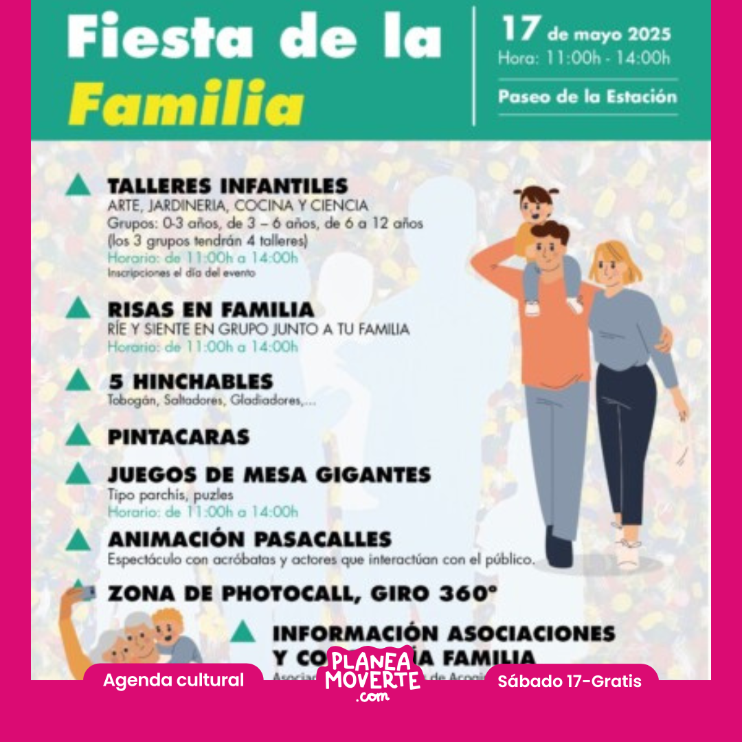 El Paseo de la Estación acoge el sábado 17 de mayo la II Fiesta de la Familia. El evento se llevará a cabo desde las 11.00 hasta las 14.00 h con actividades como talleres infantiles, arte, relajación, además de juegos de mesa tradicionales y pinta caras. Podéis ver toda la programación aquí
