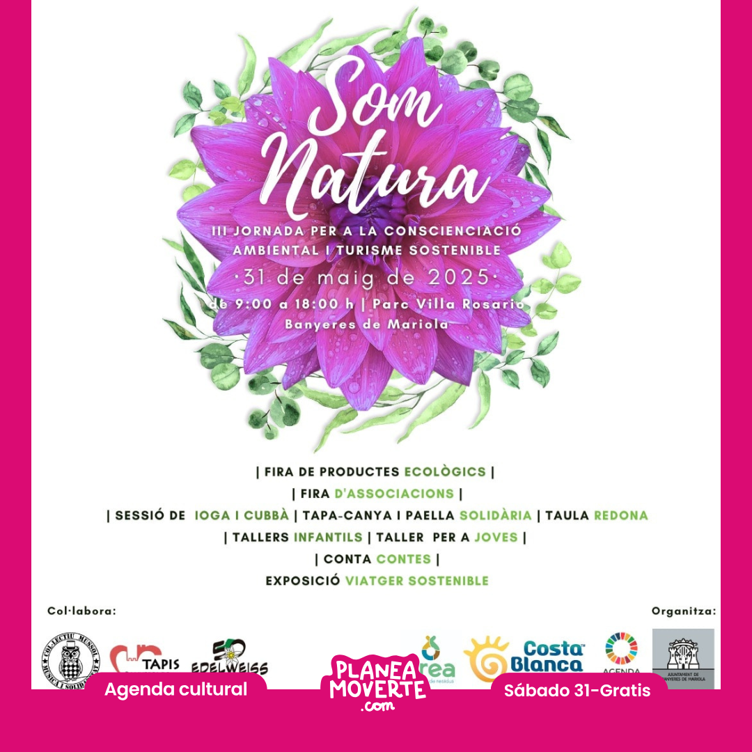 Celebraremos la jornada "SOMOS NATURA", una oportunidad para tratar colectivamente la cura y la defensa de la natura de una manera educativa, lúdica y festiva. En esta jornada habrá: Fireta de productos ecológico, feria de asociaciones y entidades de voluntariado ecologista, sesión de yoga y cubbà, talleres infantiles, actuación a cargo de Epi Epi A: "Som Ací" y actuación final de circo con la Trócola circ. Podéis ver toda la programación aquí
