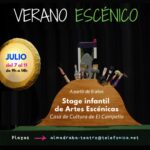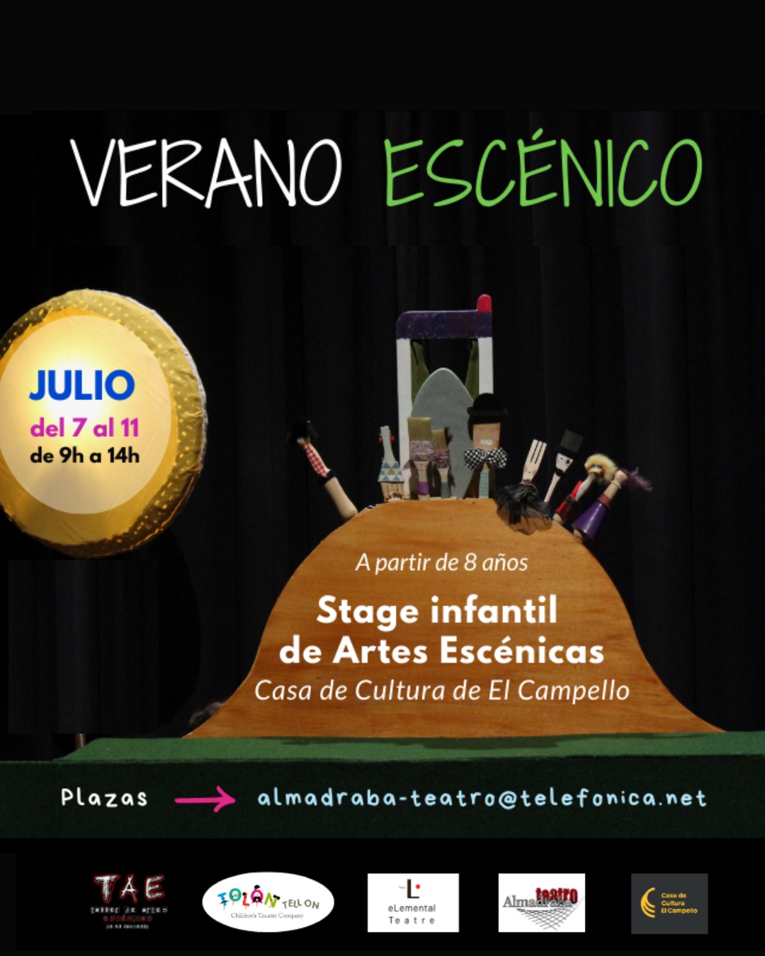 Stage infantil de verano de Artes Escénicas en El Campello. Un taller donde vuestros niños/as de edad primaria (entre 8 y 12 años) aprenderán creatividad, trabajo en equipo, expresión corporal y lo más importante… ¡a pasárselo en grande haciendo teatro!Precio: 90€