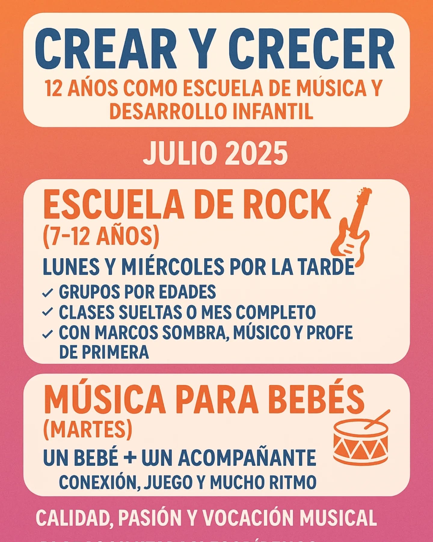 Este julio 2025, apúntate a nuestros talleres de música y vive una experiencia única llena de creatividad, diversión y aprendizaje. ¡A partir del 3 de junio ya te puedes apuntar! Para peques de 7-12 años. Grupos por edades y nivel. Con el gran Marcos Sombra, músico y profe de 10!!! Puedes venir días sueltos o todo el mesPrecio: 7 a 9 años una semana 50€ y de 10 a 12 años, una semana 60€ (hay promos por más semanas y mes)
