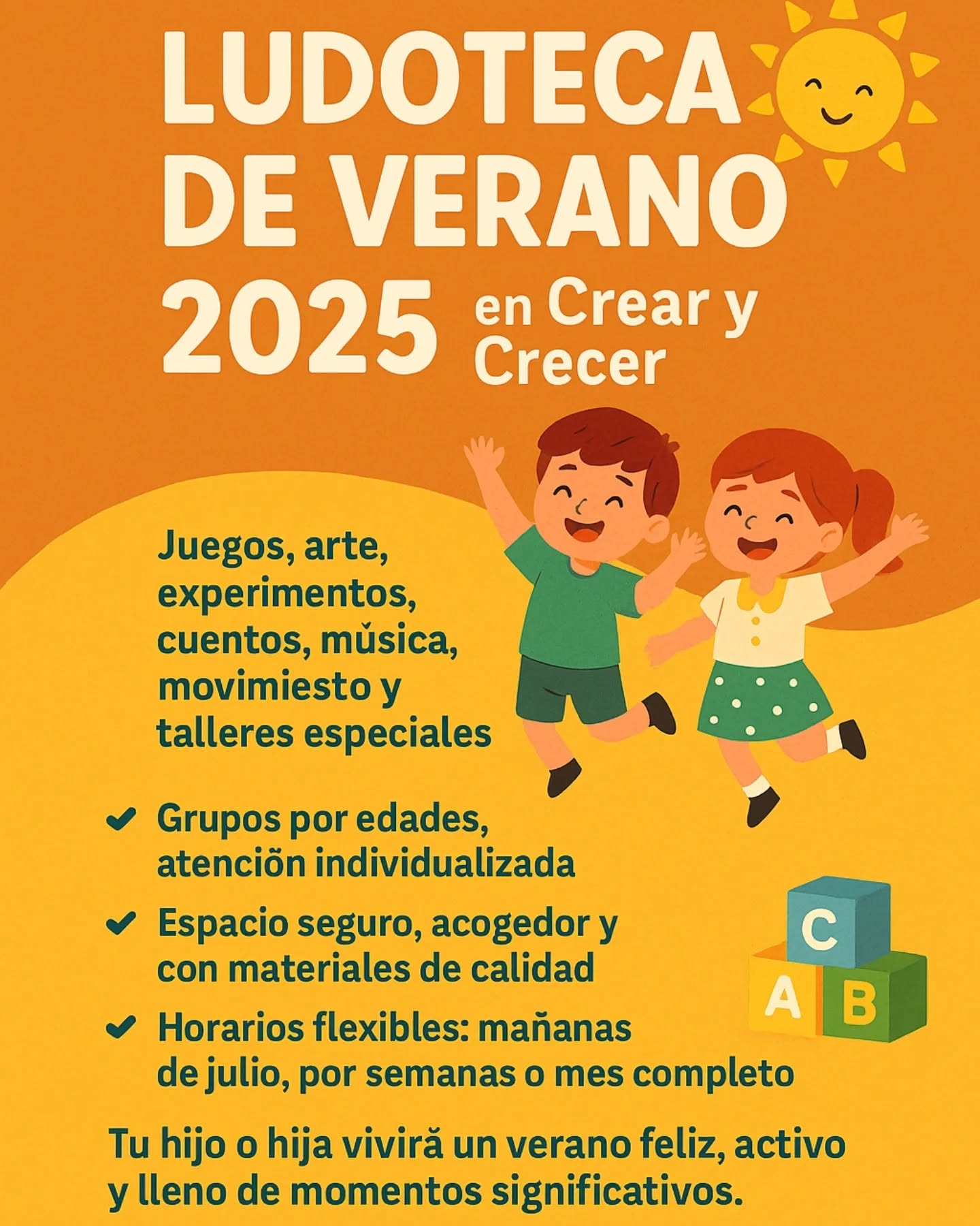 ¡Un verano lleno de juego, creatividad y alegría!¿Buscas un espacio donde tu peque disfrute, aprenda y esté bien cuidado mientras tú trabajas o simplemente organizas tu día? En Crear y Crecer llevamos 12 años acompañando a familias con cariño y profesionalismo, y este verano volvemos con una propuesta ¡que lo tiene todo! Juegos, arte, experimentos, cuentos, música, movimiento y talleres especialesGrupos por edades, atención individualizada. Espacio seguro, acogedor y con materiales de calidad. Tenéis más info aquí