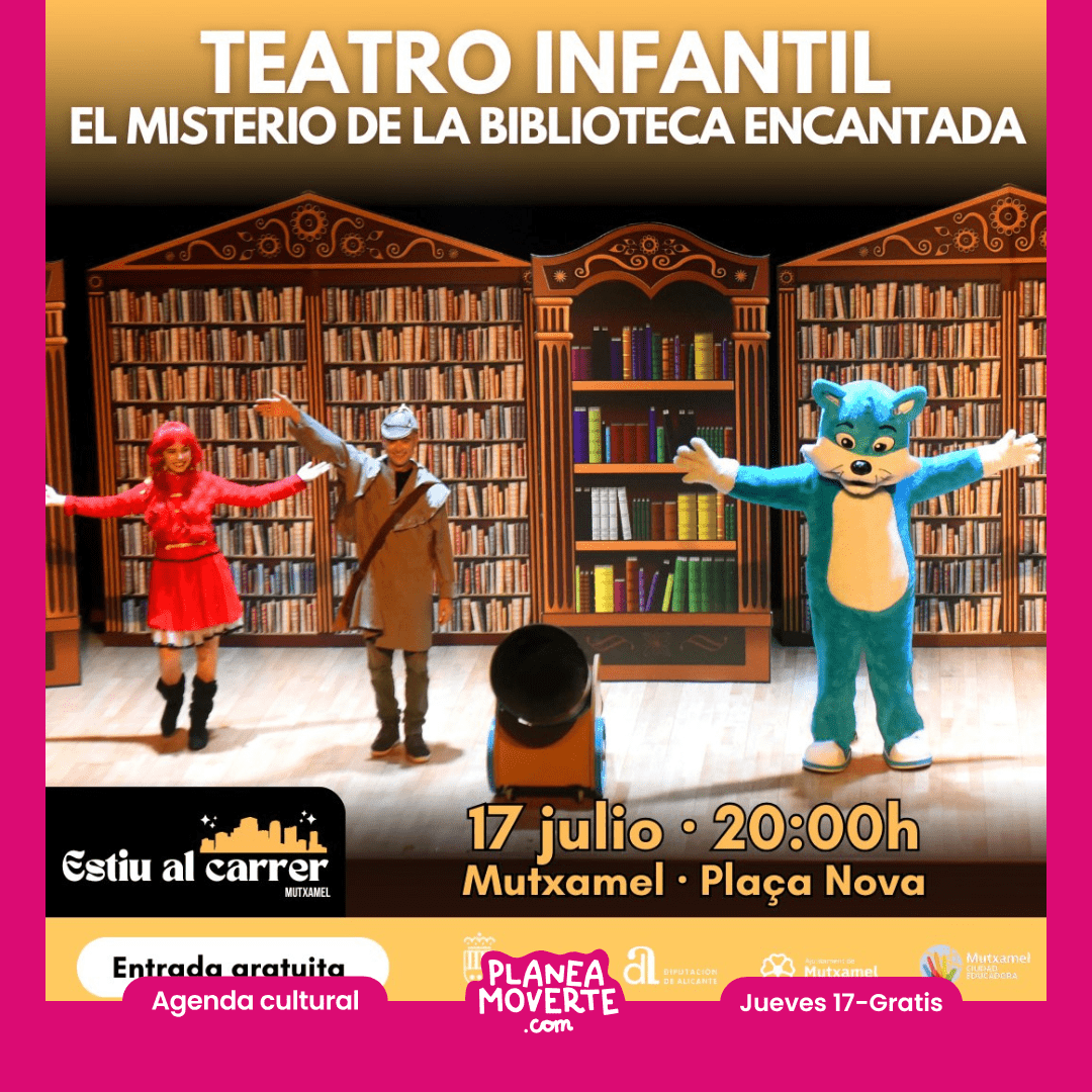¡Este verano, en el marco de L’Estiu a Mutxamel, la Plaça Nova se llena de magia, risas y aventuras para toda la familia! Ven a descubrir los secretos que esconde una biblioteca muy especial en esta divertida obra de teatro infantil llena de misterio, fantasía y personajes inolvidables.Precio: Gratuito