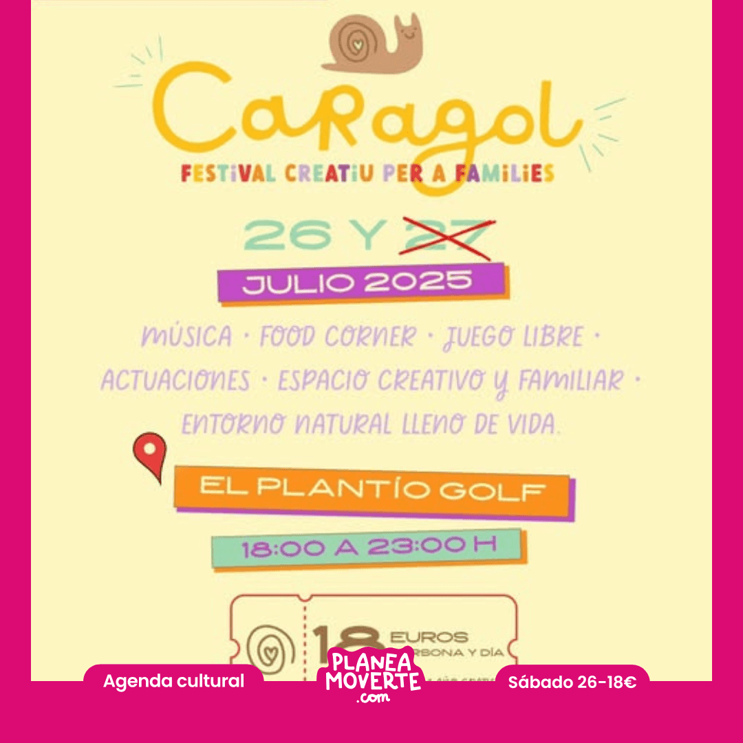 Planes con niños en el elche este fin de semanaCaragolfest es un festival creado para que las familias compartan, sientan, jueguen, conecten con la tierra y liberen su creatividad con talleres y propuestas en un espacio natural. Talleres, espacios creativos, foodtrucks, market, música y la actuación especial de Billy Mandanga y los Autitos Chocadores!