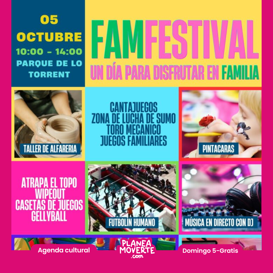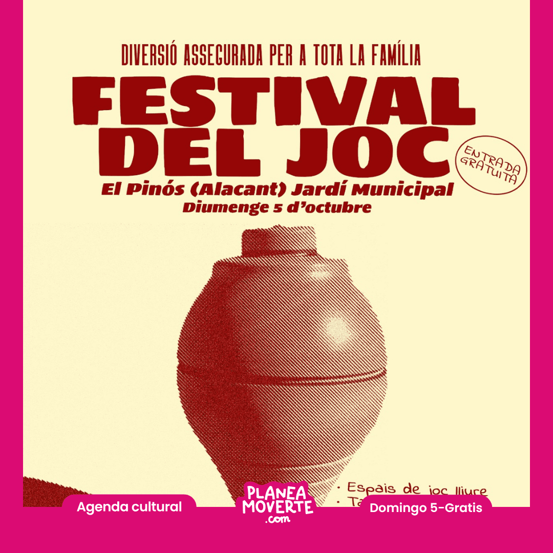 ¿qUÉ HACER ESTE domingo con niños en alicante?El próximo domingo 5 de Octubre se presenta en Pinoso el "Festival del Joc", una jornada llena de actividades, juegos, talleres y música para todo el mundo que tendrá lugar en el Jardín Municipal organizada desde las concejalías de Cultura y Juventud. Estarán los Jocs de Fusta, Circarte, Mi Minitribu y más talleres y propuestas. Además espectáculo de Tornillo Magic Clown, cuentacuentos y actuación musical del grupo musical Lairó. PLANAZO para toda la familia! Podéis ver toda la programación aquí.