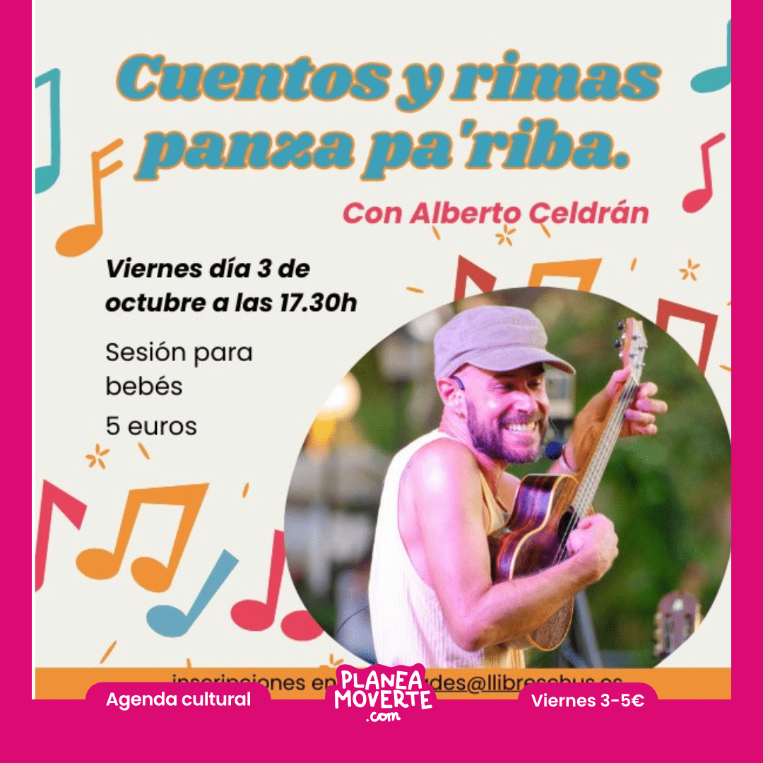 Planes para bebés en alicante Cuentos y rimas panza pa'riba. Sesión para bebés. Pequeños cuentos y canciones para disfrutar con los pequeñines de la casa, y gozar en familia del poder de la rima, la música y la palabra.  A cargo de : Alberto Celdrán de @fabricadeparaules. Destinado : de 0 a 3 años