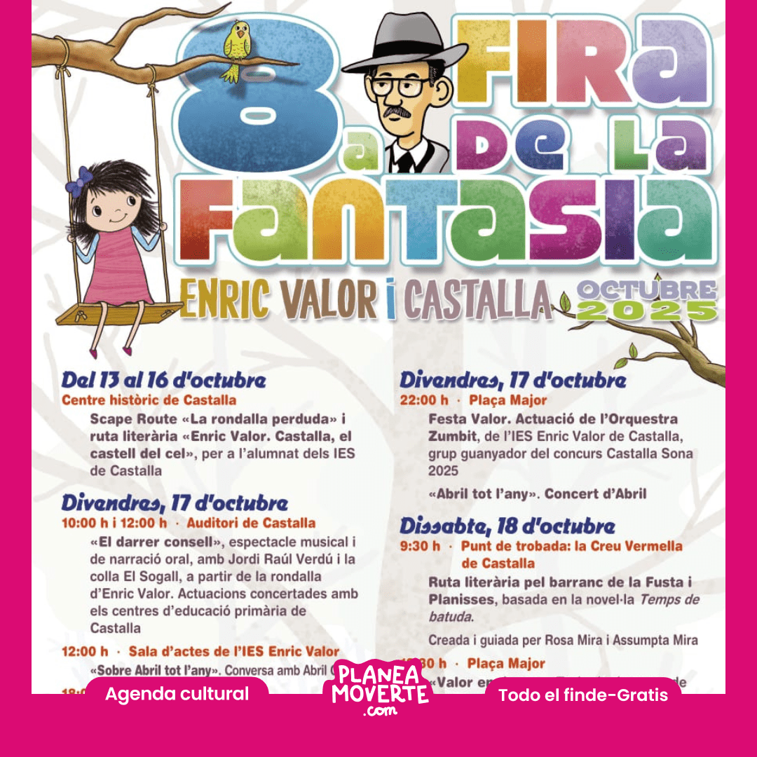 Actividades en Castalla todo el fin de semana. 8 fira de la fantasía. Plan para niños y niñasDesde el 17 al 19 de octubre Castalla se llenará de actividades, conciertos, rutas literarias, talleres para los más pequeños, juegos y mercados. Me gusta especialmente la programación del domingo. Podéis consultar todas las actividades aquí.