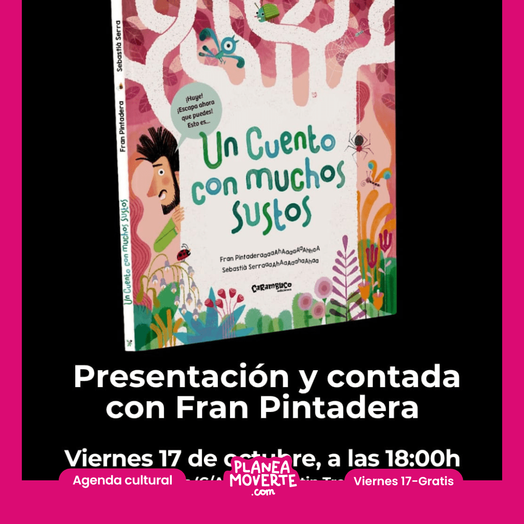 Presentación cuento "un susto muchos cuentos" fran Pintadera va de cuentosFran Pintadera es autor de un montón de cuentpos que nos encantan, como «Por qué lloramos», o «Mi papá más». Viene a Va de Cuentos a presentar «Un cuento con muchos sustos»: Eres valiente. Ya lo sé. Pero debo confesarte que este cuento te asustará.  Cuando menos te lo esperes darás un bote de tu asiento. Incluso soltarás un grito: uno grande y sonoro.Si aún así decides continuar, puedes pasar la página. Eso sí, bajo tu responsabilidad. Un cuento ilustrado con solapas, lleno de sustos y risas para leer en voz alta.Después del Cuentacuentos, habrá firma de ejemplares. Recomendado de 2 a 7 años.