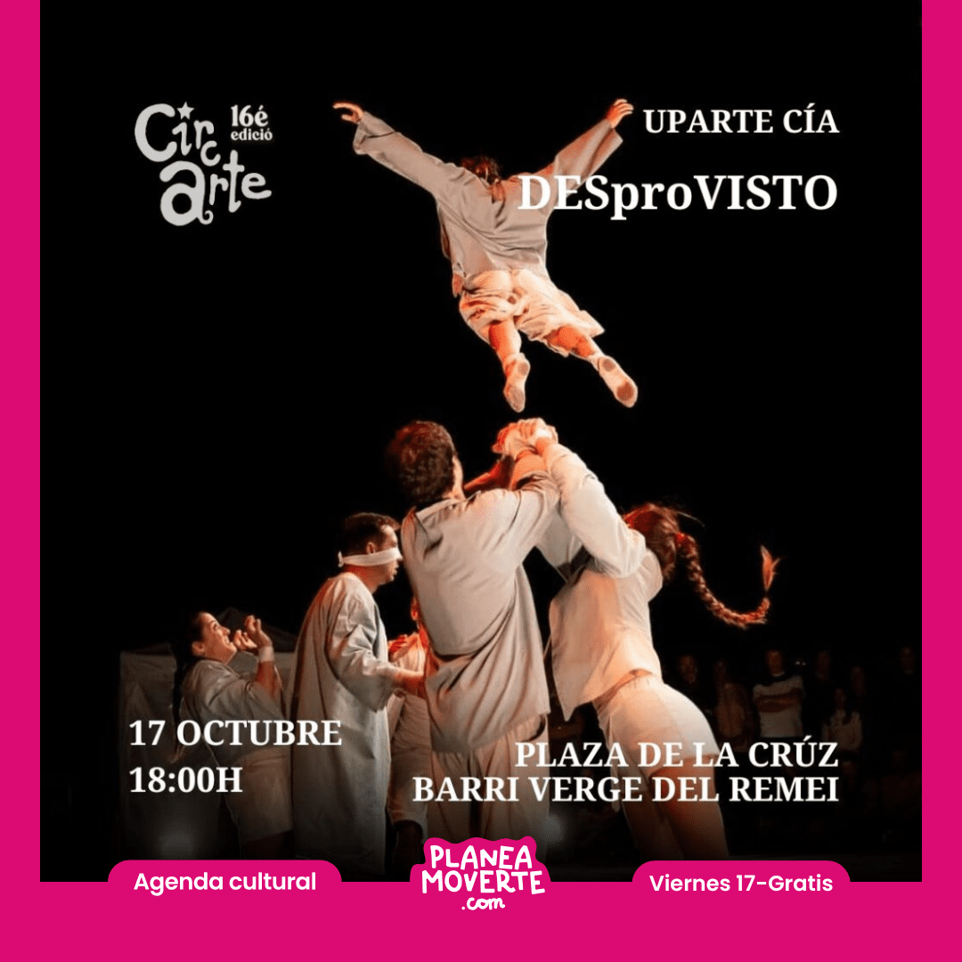 Programación circarte viernes 17 de octubre actividades para niños y familias en AlicanteLa Familia Circarte le invita a participar de una tarde diferente en el barrio Virgen del Remedio en la Zona Norte de Alicante. El mejor contexto para salir a la calle, pasar un rato divertido, conocer gente nueva, habitar el barrio y estrechar lazos comunitarios a través del juego, la música y el baile. A las 16:00h nos encontramos en la Plaza de Argel para elegir los colores que más te gustan y llenar tu cara de fantasía con pintacaras. Después elige los malabares que mas te atragan, explora y déjate sorprender. A las 17:00h déjate llevar por la marea de tambores de la Comunidad KLAKIBUM. La música y el baile te guiarán hasta la Plaza de la Cruz, donde empezará el espectáculo de Circ Desproveït, de la Compañía UpArte.