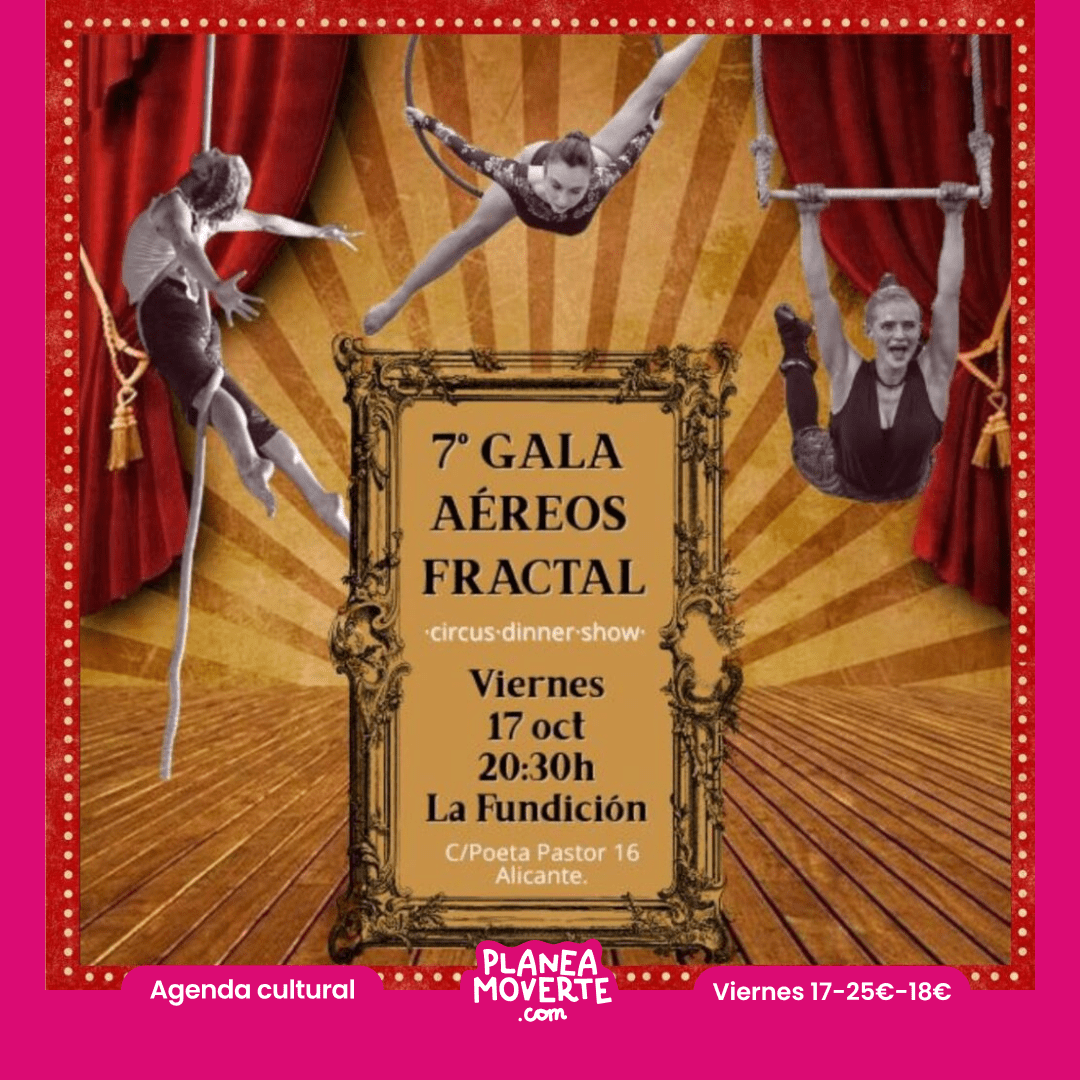 Planes viernes 17 de octubre en alicanteLo interesante de las galas de números circenses es que se componen de una sucesión de mini espectáculos y reúne a una variedad de artistas multidisciplinares en un mismo escenario. Pero lo más bonito de las Gales de Espai Fractal es que trasladan el cielo a la tierra. Busca el lugar que más te guste para degustar una deliciosa cena y contemplar arte. Te sentirás como en las nubes.