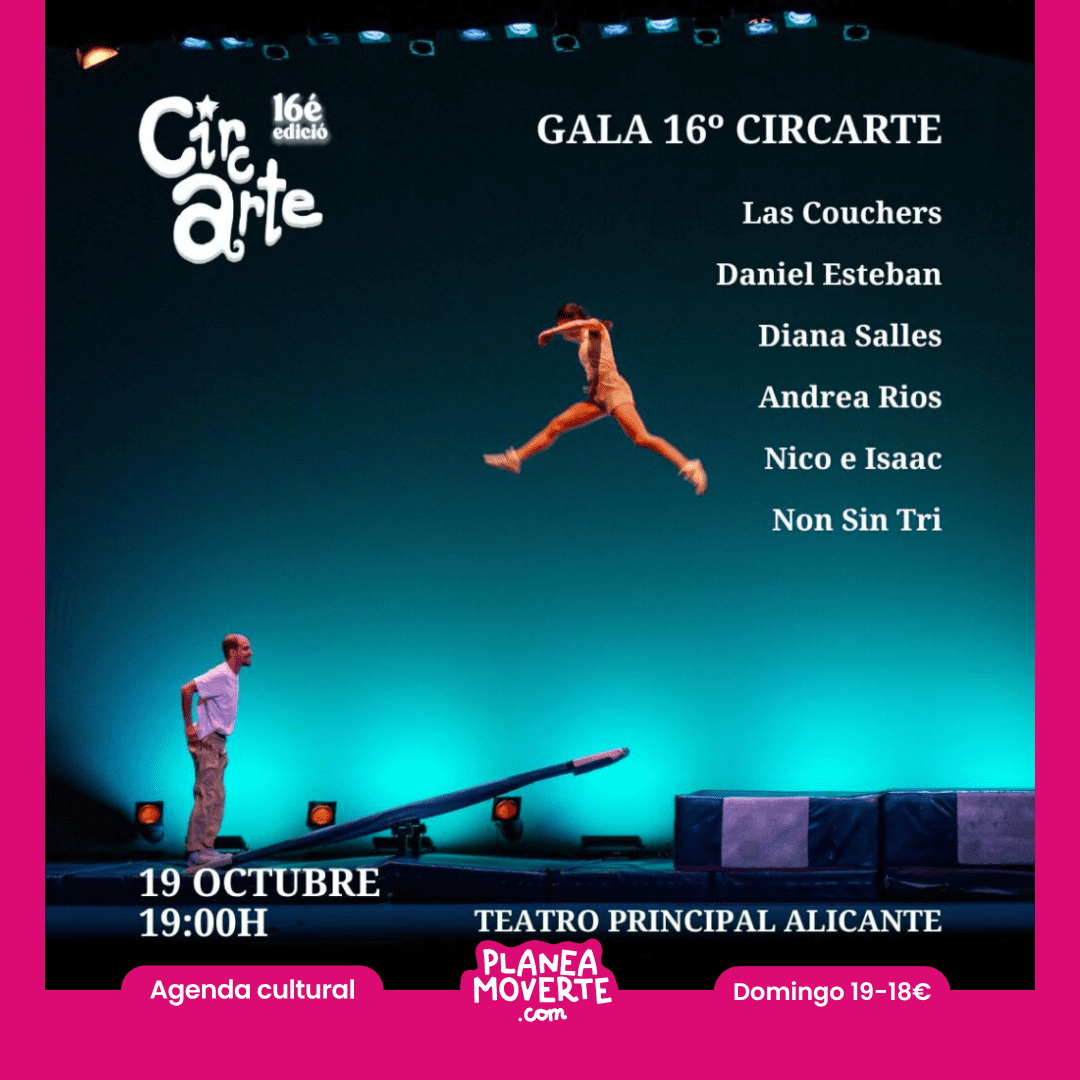 Gala de Circo en el teatro principal de alicante para público familiar el 19 de octubreEl Festival Circarte celebra su 16ª edición con la Gran Gala de Circo. Un espectáculo único creado para la ocasión, que muestra la poética, el humor, las capacidades sobrehumanas y la belleza de artistas que entienden al circo como expresión artística, sin explotación humana ni animal, como medio de intercambio y fusión cultural.