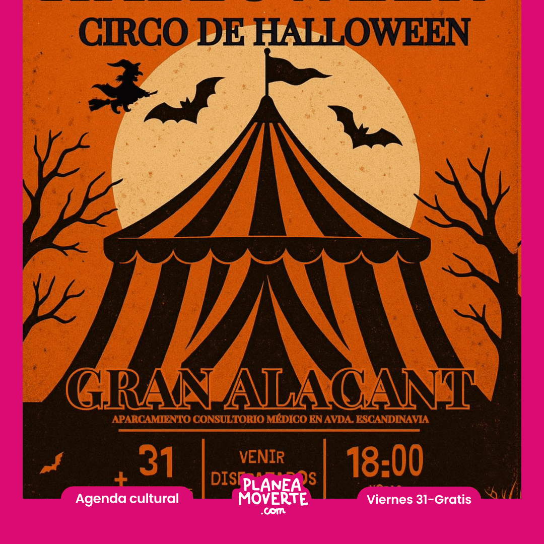 Planes de halloween en gran alacant 2025 para disfrutar con niños en alicanteCirco de Halloween al aire libre. Un espectáculo familiar de circo con los artistas característicos de Halloween. Apto para todos los públicos.