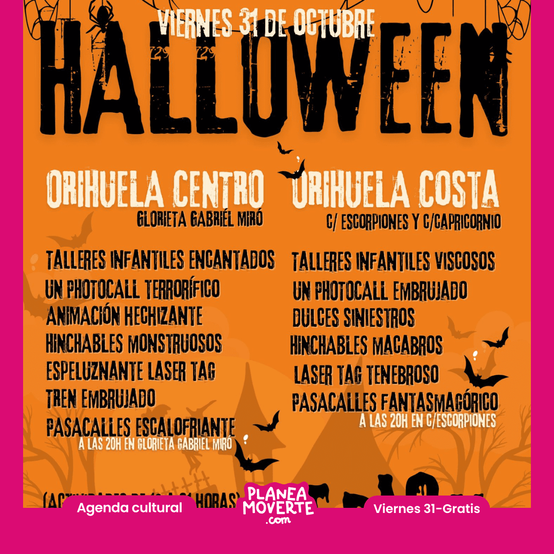 Planes de halloween en Orihuela centro y Orihuela costaTalleres de slime, manualidades, pintacaras, hinchables temáticos y personajes recorriendo las calles. La tarde culmina con un gran pasacalles a las 20:00 hrs lleno de música y ambiente festivo. Tenéis más información aquí.