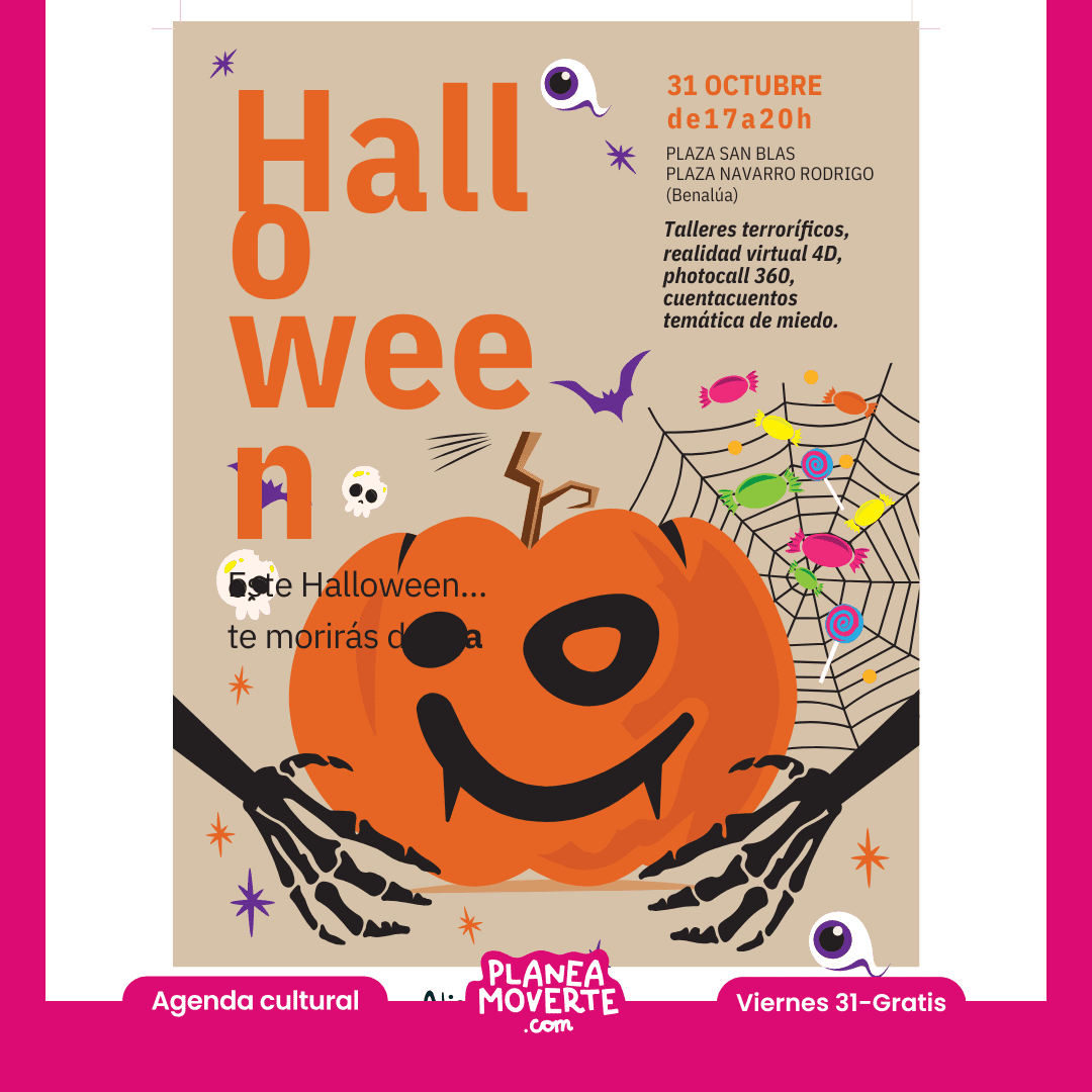 Halloween 2025 planes en alicante para toda la familia. san blas y benalúaLas dos jornadas de la plaza de San Blas y de Navarro Rodrigo, darán comienzo con talleres terroríficos, atracciones, realidad virtual 4D, caramelos, photocall 360, juegos, actividades con animaciones y música, dirigidas sobre todo al público infantil al que animamos a venir disfrazado, con el objetivo de atraer clientes a las zonas comerciales de la ciudad.