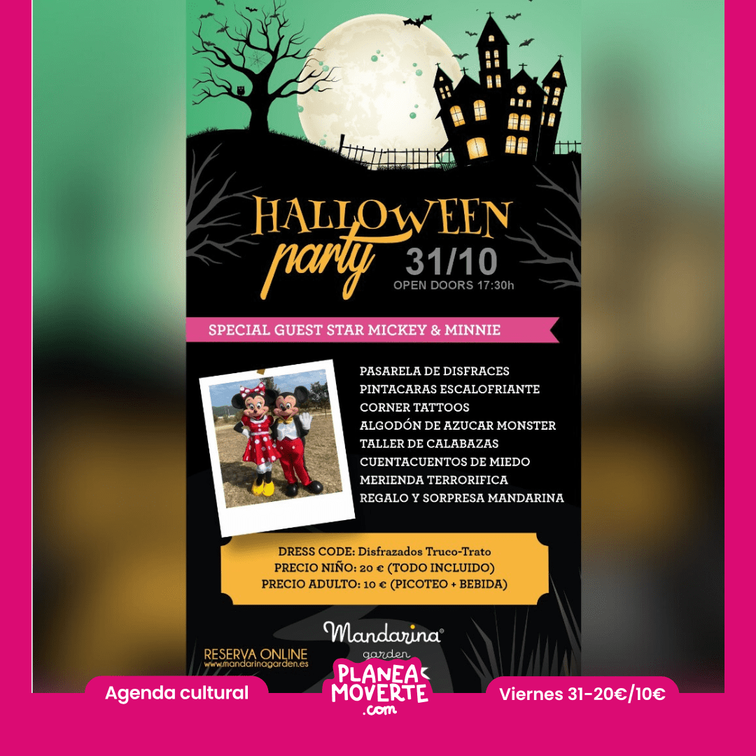 Planes de halloween en playa de san juan alicante este 2025¡La noche más esperada llega con invitados muy especiales! Este 31 de octubre a las 17:30h vive la Halloween Party más divertida en Mandarina Garden con la visita de Mickey & Minnie. Pasarela de disfraces. Pintacaras y tattoos. Algodón de azúcar MONSTER.  Taller de calabazas.  Cuentacuentos de miedo. Merienda terrorífica. Regalos y sorpresa Mandarina.