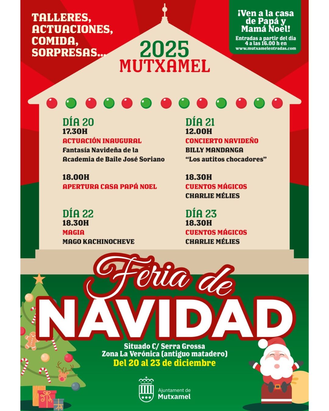 Planes con niños del 19 al 23 de diciembre en alicante: feria de navidad mutxamelEl Ayuntamiento de Mutxamel te invita a disfrutar de la Feria de Navidad con varias actuaciones todo el fin de semana. Las entradas para la casita de Papá Noel están agotadas, pero podéis ir a disfrutar de todas las actuaciones. Bailes, música, cuentos y muchas sorpresas para vivir la magia de la Navidad en Mutxamel. Podéis ver toda la programación aquí