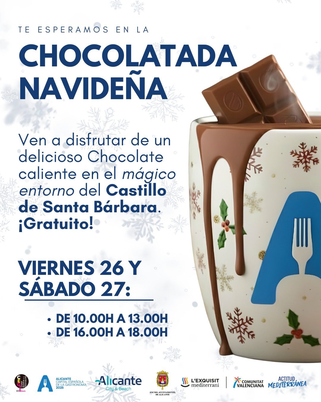 Esta Navidad sabe a chocolate en el Castillo de Santa Bárbara. Lo alto de Alicante se llena de ilusión para recibir a amigos, familias y peques con una chocolatada navideña gratuita durante los días.Durante la mañana, los más pequeños podrán vivir la magia de la Navidad con la visita del Cartero Real, disfrutar de actividades infantiles y dar rienda suelta a su creatividad en talleres de manualidades. La chocolatada estará disponible por la mañana y por la tarde, para que nadie se quede sin su momento dulce. Un plan perfecto para compartir, disfrutar y crear recuerdos inolvidables en uno de los lugares más emblemáticos de la ciudad. Te esperamos para celebrar la Navidad como nunca.