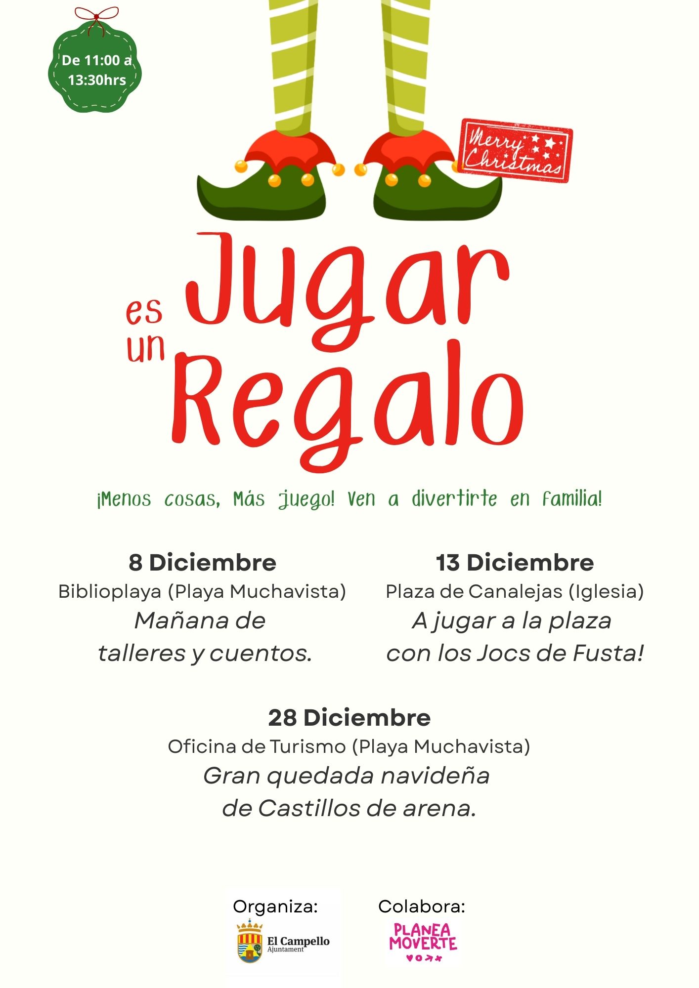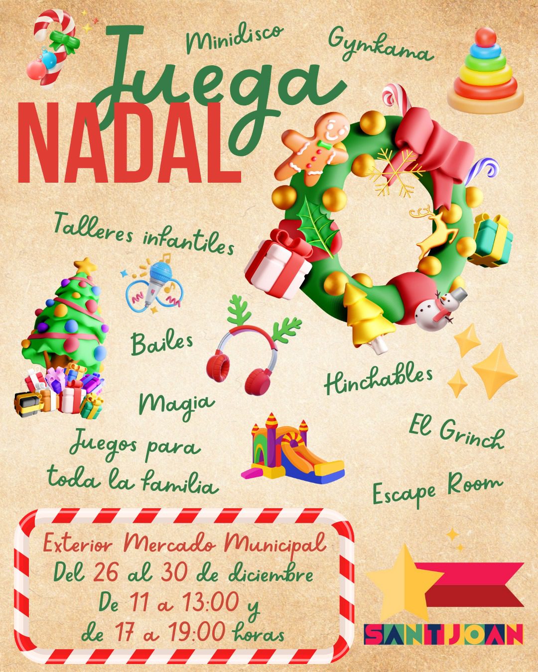 El Ayuntamiento de Sant Joan d'Alacant ha preparado varios días de atracciones infantiles para que los niños y niñas disfruten de la Navidad en familia. Entre el 26 y el 30 de diciembre, el exterior del Mercado Municipal se llenará de juegos, bailes, visitas sorpresa y atracciones para todos los gustos. Juega Nadal tendrá una oferta de ocio distinta en cada jornada. Durante esos días tendremos hinchables, talleres de pintacaras, globoflexia y tatuajes, escape room, juegos de madera tradicionales y juegos XL, show de títeres y magia, payaso, gymkana grupal, bailes, concurso musical, minidisco y visitas de personajes como el Grinch, Spiderman, Elsa o Pikachu.