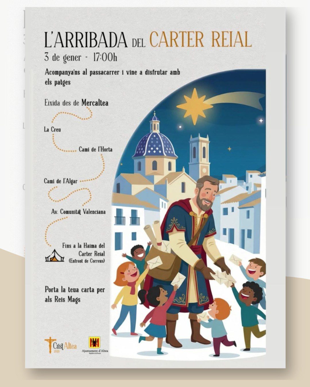El Cartero Real llenará Altea de magia y tradición el próximo 3 de enero. El sábado a partir de las 17:00 h, Altea acogerá un animado pasacalle desde Mercaltea hasta la haima del Cartero Real, situada frente a Correos. Los niños y niñas podrán entregar su carta a los Reyes Magos acompañados de música, animación y pajes reales. Al finalizar el acto se ofrecerá chocolate caliente para todos y todas, gracias a la Comisión del Cristo 2026, en un ambiente de convivencia y hermandad. Más info aquíPrecio: Gratis