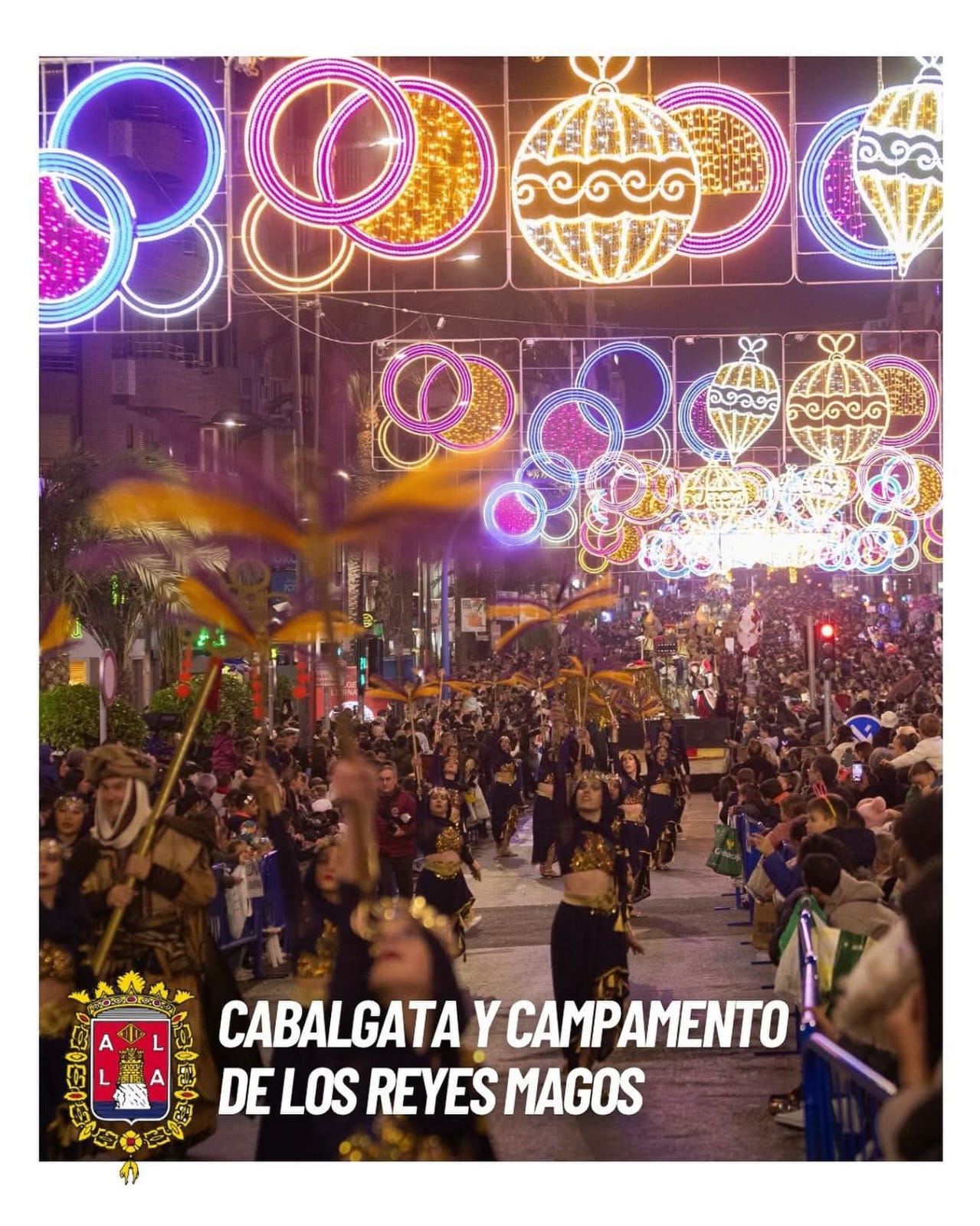 - Recorrido: Se inicia a las 18.30 h. desde la Font Redona, recorriendo la calle de Sant Nicolau, plaça d'Espanya, calle de Sant Llorenç y finaliza alrededor de las 21 h. al final de la Av. Pais Valencià. En la lejanía de la montaña de Sant Cristòfol, luces de hogueras y bengalas simulan el campamento de los Reyes del Oriente.