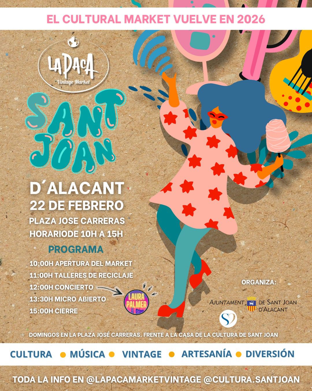Planes domingo 22 de febrero en alicante. sant joan marketVuelve el Cultural Market a Sant Joan d'Alacant!  Este 22 de febrero nos vemos en la Plaza José Carreras para vivir un domingo diferente. Música, tesoros vintage y talleres para los más peques. ¿Te vienes a disfrutar del tardeo (bueno, ¡del mañaneo!) con nosotros? EVENTO GRATUITO. Apunta el plan: 10:00h - Apertura. 11:00h - Talleres de reciclaje. 12:00h - Concierto de @LauraPalmer.  13:30h - Micro abierto. 15:00h - Cierre