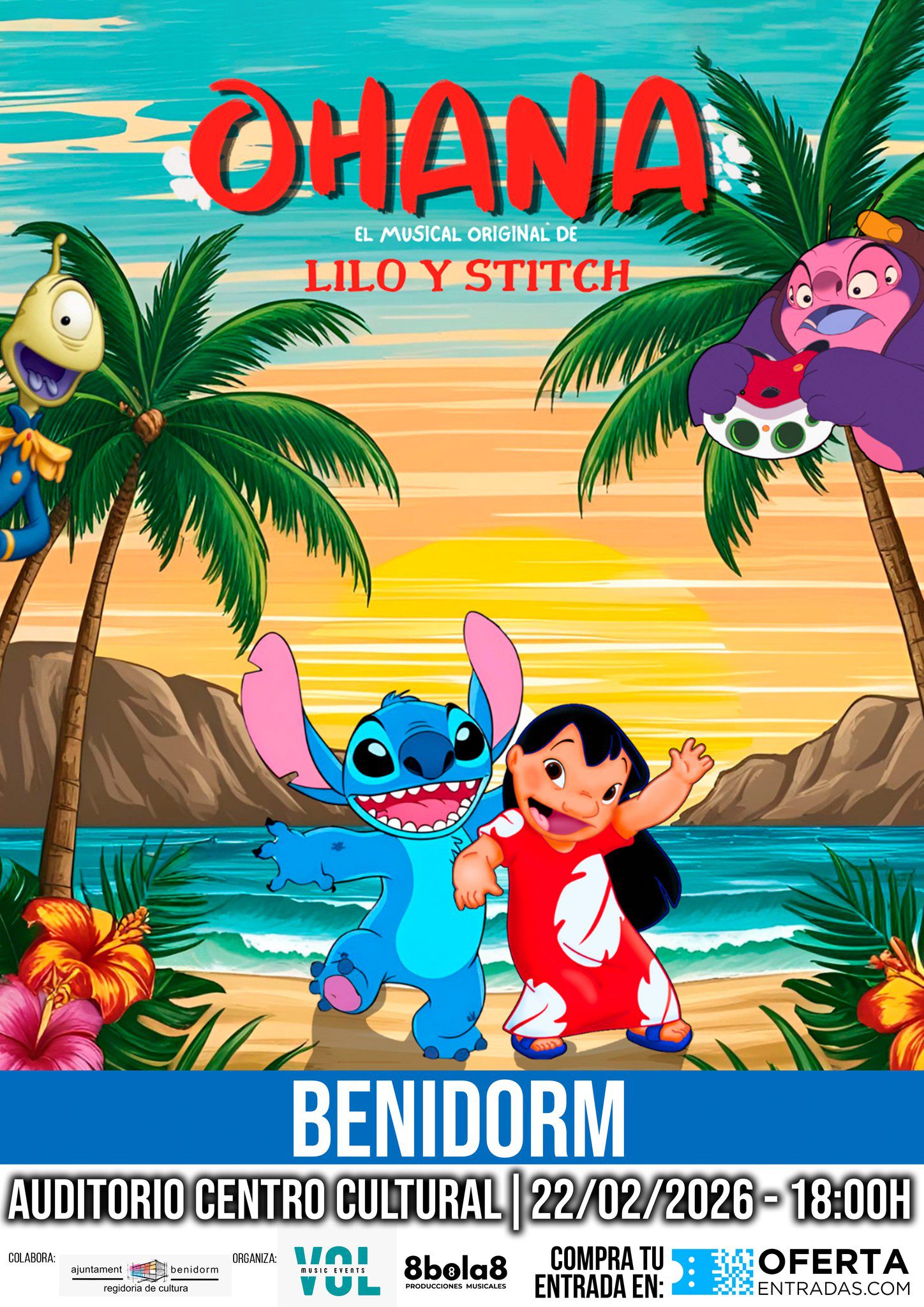 Ohana teatro musical- Planes con niños en benidormEl experimento 626, creado por el Doctor Jumba con el objetivo de generar destrucción, escapa y aterriza en Hawái. Allí conoce a Lilo, una niña solitaria que lo llama Stitch. Mientras Jumba y Pleakley intentan capturarlo, Stitch aprenderá el verdadero significado de la “Amistad” y de la “Familia”. El musical nos recuerda que, sin importar de dónde vengamos, todos necesitamos un lugar al que llamar Hogar.