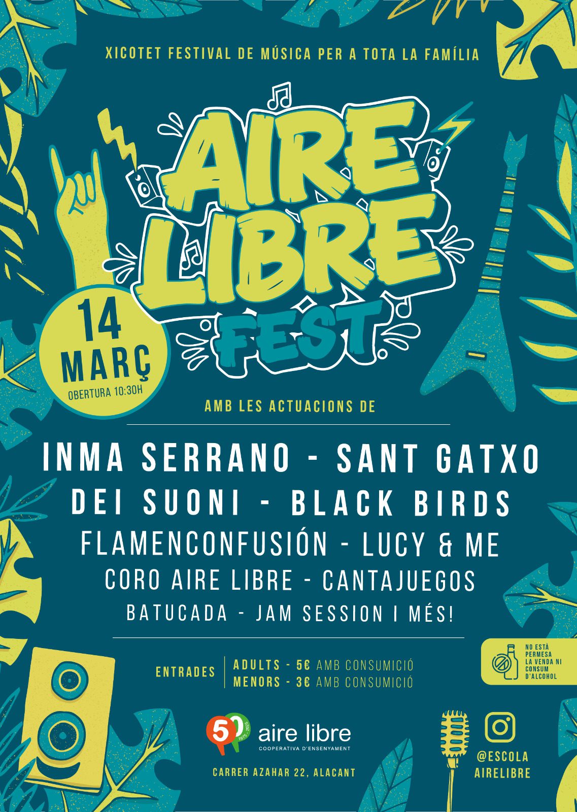 La Escuela Aire Libre organiza la 1ª edición del Aire Libre Fest. Habrá muchas actividades, talleres, cantina con paella y bbq, (trae tus platos para evitar los de un solo uso) y muchas ganas de disfrutar de un día en familia con la Música como telón de fondo.