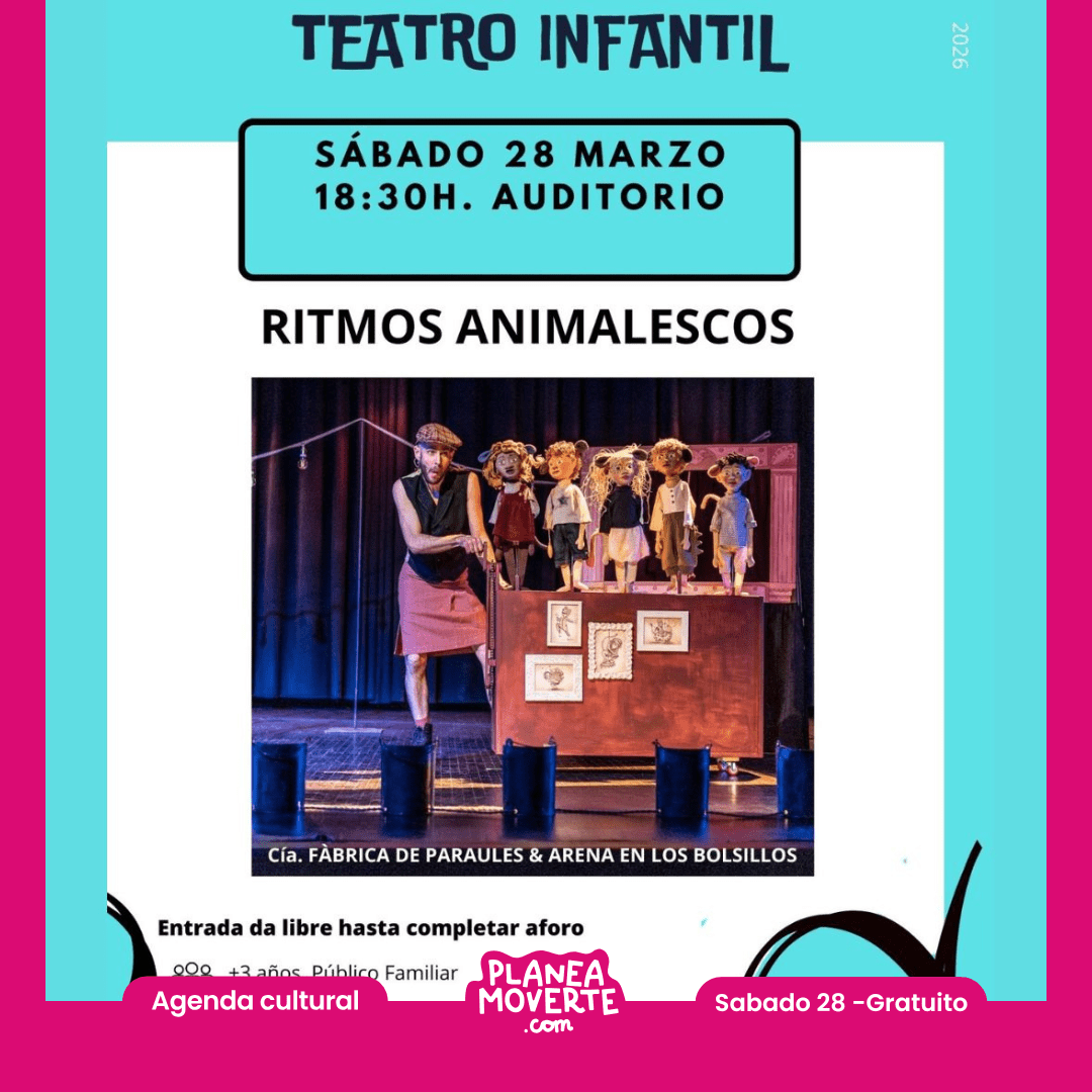 Teatro infantil en Calpe. Ritmos animalescos. Planes con niñosEl Auditorio de Calp acoge este sábado el teatro infantil “Ritmos animalescos” de la compañía Fàbrica de Paraules & Arena en los bolsillos. Recomendada para peques a partir de 3 años.