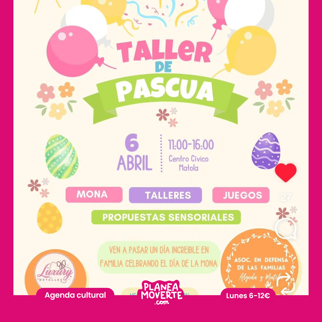 Taller de pascua en Elche. Planes día de la mona en alicante con niñosEste 6 de abril ven a disfrutar de un día mágico en familia. Tendremos: Talleres creativos,  Juegos divertidos, Mona de Pascua, Propuestas sensoriales y Photocall.  Un plan perfecto para compartir, reír y celebrar juntos el Día de la Mona. Podéis ver más info aquí