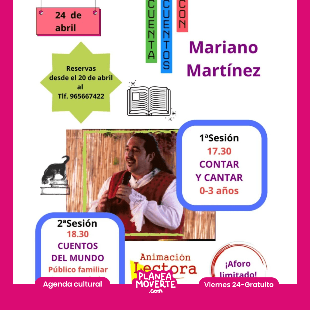 qué hacer este viernes en alicante con niñosEl viernes 24 de abril te esperamos en la Biblioteca Miguel Delibes con una tarde llena de historias de la mano de Mariano Martínez. 17:30 h — Sesión para bebés (hasta 3 años) 18:30 h — Sesión familiar (recomendada a partir de 4 años)