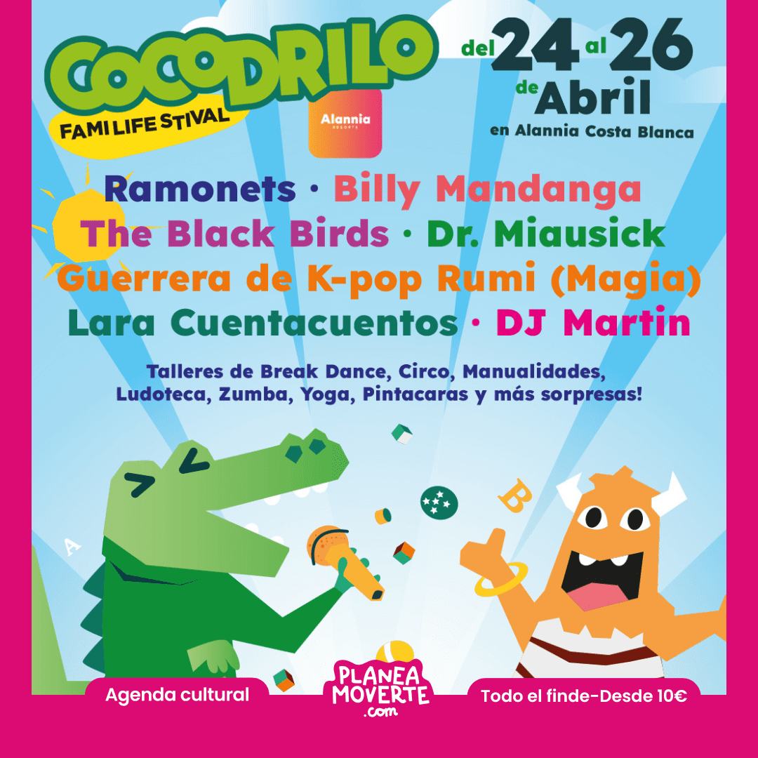 cocodrilo festival alicante. Qué hacer este fin de semana en alicanteYa está aquí el CARTEL del Cocodrilo Family Festival! Del 24 al 26 de abril, vuelven la música en directo, espectáculos, talleres, diversión sin pantallas y momentos que vuestros peques recordarán siempre.Un día para bailar juntos, para reír sin prisas., para crear recuerdos en familia... Este no es solo un festival, ¡es un planazo para compartir!