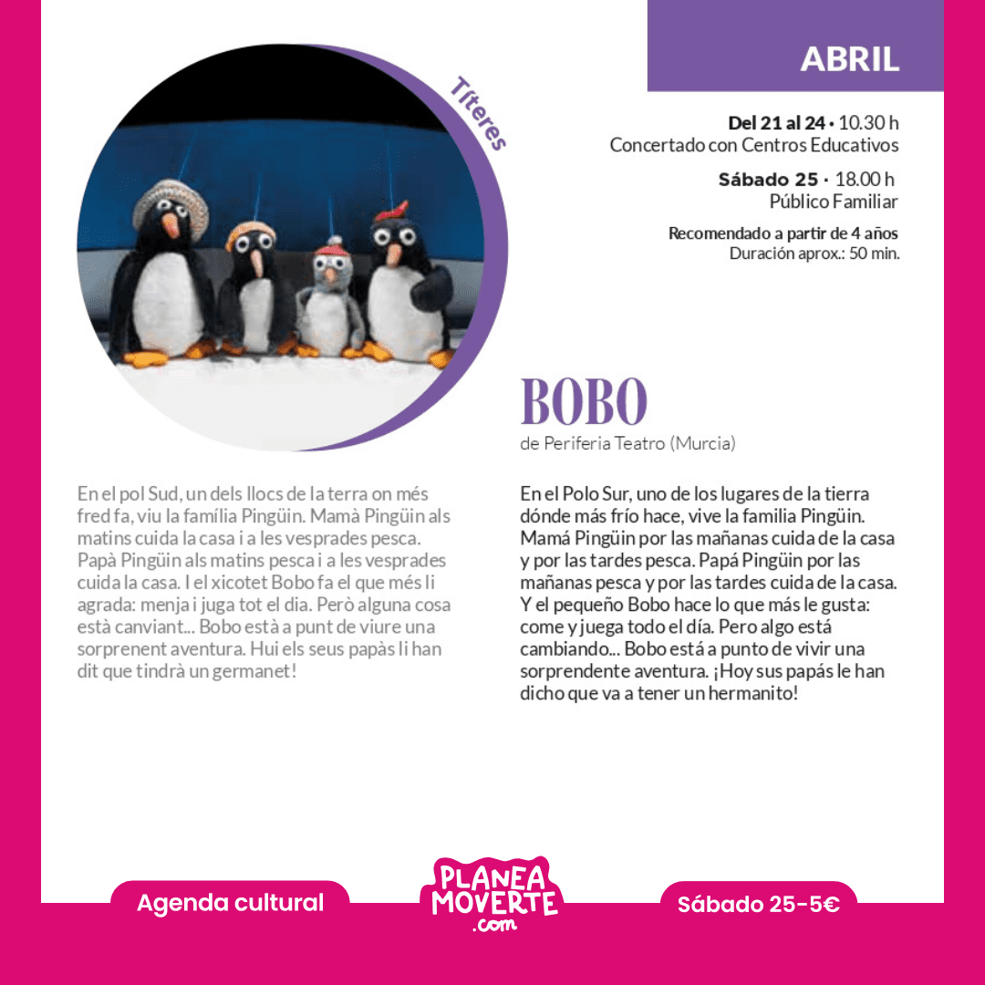 Bobo qué hacer este fin de semana en elche con niñosEn el Polo Sur, uno de los lugares de la tierra dónde más frío hace, vive la familia Pingüin. Mamá Pingüin por las mañanas cuida de la casa y por las tardes pesca. Papá Pingüin por las mañanas pesca y por las tardes cuida de la casa. Y el pequeño Bobo hace lo que más le gusta: come y juega todo el día. Pero algo está cambiando, Bobo está a punto de vivir una sorprendente aventura: ¡Hoy sus papás le han dicho que va a tener un hermanito! Recomendado a partir de 4 años.