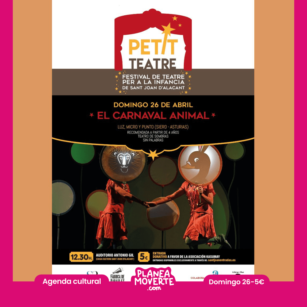 Petit teatre, un carnaval animal. Planes domingo 26 de abril en alicante con niñosUn espectáculo para soñar, emocionarse y compartir en familia. Amanece en el bosque y… ¡es día de carnaval! Animales que se disfrazan, bailan y celebran hasta que un rugido lo cambia todo. Una historia tierna y poética que nos habla de amistad, solidaridad y empatía, acompañada por la maravillosa música de “El Carnaval de los Animales” de Camille Saint‑Saëns.  Espectáculo sin texto, lleno de poesía visual. Recomendado a partir de 4 años.
